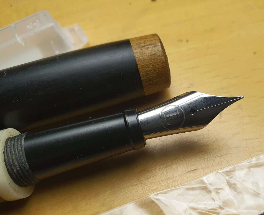 Jeg arbejder på at udvikle en ny fyldepen, som er næsten helt lavet af mig. Det vil sige, at jeg ikke alene drejer træstykkerne, men også de dele, der har gevind. Det øver jeg mig på. Og så er der det man kalder ‘the section’. Det er den del der ses mellem spidsen og gevindet til venstre på billedet. Der er også to gevind på den del; det ene for at skrue det i penneskaftet og det andet for at skrue ‘feederen’ ind i det sorte rør. Det er et ret fint gevind, som jeg skal have øvet mig i.