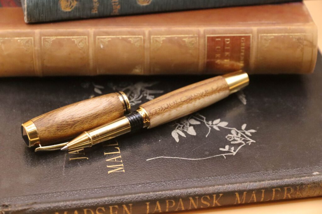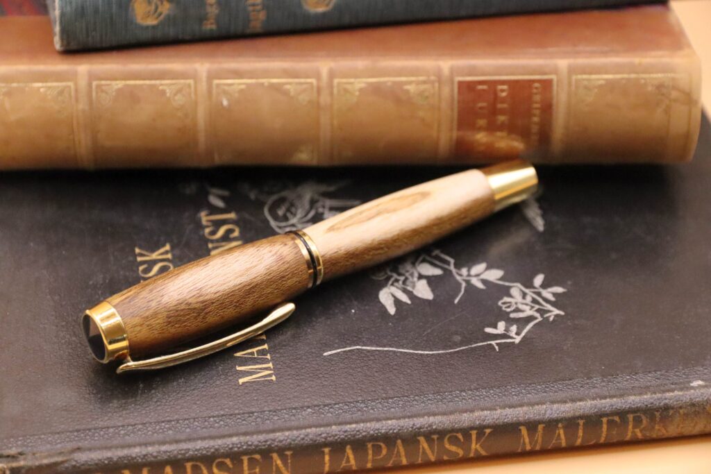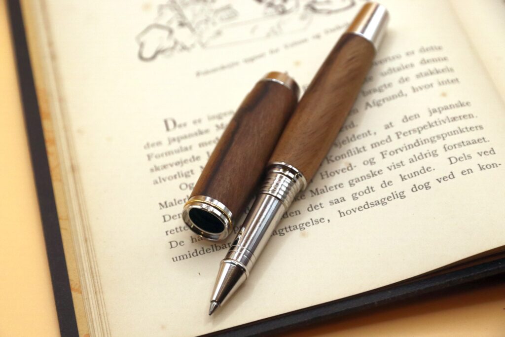 Når man får sådan en pen på bænken igen, sker det jo at man kan genkende den. Den er flere år gammel og træet er fra et træ, som man måske ikke længere har noget af. Jeg har meget lidt tilbage af den gamle danske valnød som én af pennene er drejet af. Det var en valnød som stod i Jægerspris. Den var stor og mere end 100 år gammel. Da jeg – det var vel i 2012 kom forbi efter en nattevagt på Grevinde-Danners børnehjem på slottet, så jeg at min handyman var ved at tage den ned. Så jeg svingede bilen ind og skyndte mig at tale for min syge moster. Og jeg fik skam nogle stykker med i baggagerummet. De var flotte og med farvespil. Der var også stjerneskøre, som der altid er i de store gamle træer, men det gjorde knap så meget for mig, for jeg skal bare finde en måde at skære udenom på, og jeg skal jo ret beset ikke bruge meget til, at dreje en pen. Men jeg vil gerne have stor frihed til at finde det rigtige snit.