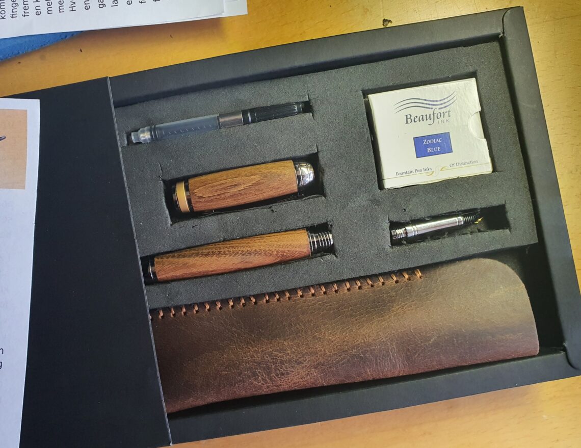 Der fjumres med noget æskeudvikling … Det er stadig på tidlig prototype niveau, men der sker noget hver uge. Det bliver aldrig masseproduktion, men små serier kommer nok på tale. Der skal være instruktion og certifikat og detaljerne skal på plads. Det er i øvrigt en lille lækker fyldepen i guldregn fra Kornerup. Den stod ved åen. Man kan godt…